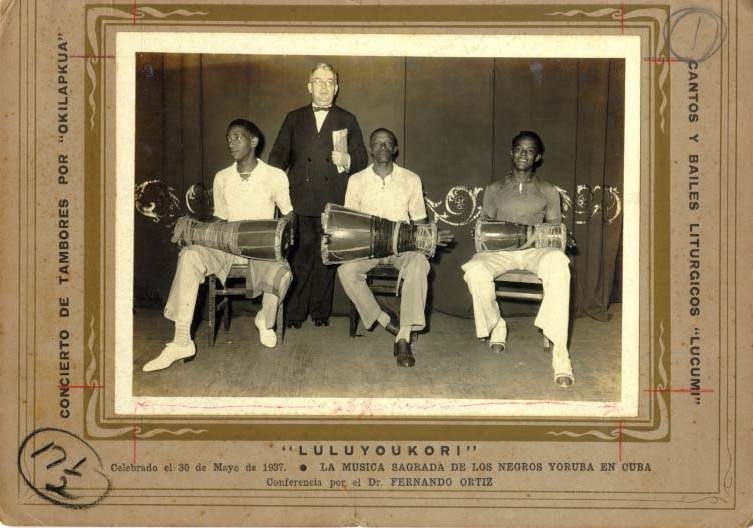 Retrato de Fernando Ortiz con los músicos que lo acompañaron en la conferencia: La música sagrada de los negros yorubas en cuba. 30 de mayo 1937
