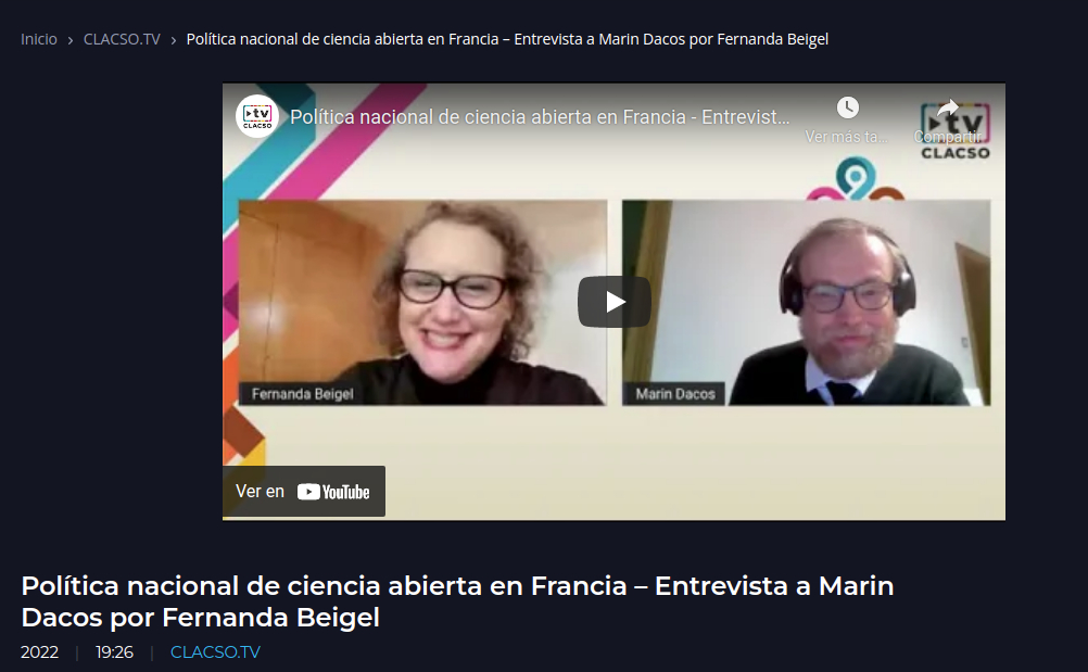 En esta oportunidad, desde FOLEC-CLACSO, difundimos la entrevista realizada por Fernanda Beigel (UNCuyo/CONICET y preside el Comité Asesor en Ciencia Abierta del Ministerio de Ciencia de Argentina), a Marin Dacos, Consejero para la Ciencia Abierta del Ministerio de Educación, Investigación e Innovación de Francia, donde se ha aprobado el Segundo Plan Nacional para la Ciencia Abierta 2021-2024. Los miembros del Comité para la Ciencia Abierta de Francia cumplen un rol fundamental en la redacción de los planes nacionales de ciencia abierta, y su implementación.