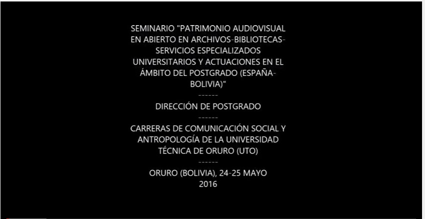 Patrimonio audiovisual en archivos-bibliotecas-servicios universitarios y en postgrado (España-Bolivia): seminario en Oruro-Bolivia. Organizado y coordinado por Dirección de Postgrado de la Universidad Técnica de Oruro (Bolivia). En el ámbito de las Carreras de Comunicación Social y Antropología, 24-25 mayo 2016. Organización-Coordinación: Dr. Ricardo Jorge Llanque Ferrufino, Director de Postgrado de la Universidad Técnica de Oruro (UTO). Celebración: Instalaciones Carrera de Comunicación Social y Carrera de Antropología. Incluye Instantáneas sobre Patrimonio cultural, documental, informativo, artístico, arquitectónico, histórico, bibliográfico... boliviano (Oruro) 23-25 mayo 2016. Fotos y vídeos realizados por Alfonso López Yepes y publicados en RTVDoc. Servicio de Documentación Multimedia. Facultad Ciencias de la Información. Universidad Complutense Madrid.